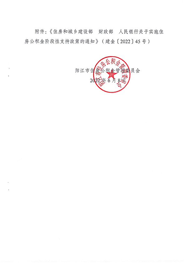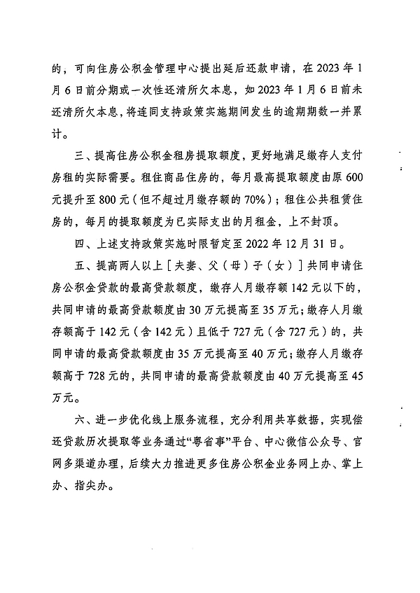 陽(yáng)江市住房公積金管理委員會(huì)關(guān)于我市實(shí)施住房公積金階段性支持政策的通知 為貫徹落實(shí)黨中央、國(guó)務(wù)院關(guān)于高效統(tǒng)籌疫情防控和經(jīng)濟(jì)社會(huì)發(fā)展的決策部署,進(jìn)一步加大住房公積金助企紓困力度,幫助受疫情影響的企業(yè)和繳存人共同渡過難關(guān),根據(jù)住房和城鄉(xiāng)建設(shè)部財(cái)政部人民銀行《關(guān)于實(shí)施住房公積金階段性支持政策的通知》(建金〔2022〕45號(hào))精神,現(xiàn)就我市實(shí)施住房公積金階段性支持政策通知如下: 各繳存單位、繳存人: 為貫徹落實(shí)黨中央、國(guó)務(wù)院關(guān)于高效統(tǒng)籌疫情防控和經(jīng)濟(jì)社會(huì)發(fā)展的決策部署,進(jìn)一步加大住房公積金助企紓困力度,幫助受疫情影響的企業(yè)和繳存人共同渡過難關(guān),根據(jù)住房和城鄉(xiāng)建設(shè)部財(cái)政部人民銀行《關(guān)于實(shí)施住房公積金階段性支持政策的通知》(建金〔2022〕45號(hào))精神,現(xiàn)就我市實(shí)施住房公積金階段性支持政策通知如下: 一、受新冠肺炎疫情影響的企業(yè),可按規(guī)定申請(qǐng)緩繳住房公積金,到期后進(jìn)行補(bǔ)繳。在此期間,繳存職工正常提取和申請(qǐng)住房公積金貸款,不受緩繳影響。 二、受新冠肺炎疫情影響的繳存人,不能正常償還住房公積金貸款的,不作逾期處理,不計(jì)收罰息,不作為逾期記錄報(bào)送征信部門。預(yù)計(jì)2022年12月31日前不能按期正常償還貸款本息的,可向住房公積金管理中心提出延后還款申請(qǐng),在2023年1月6日前分期或一次性還清所欠本息,如2023年1月6日前未還清所欠本息,將連同支持政策實(shí)施期間發(fā)生的逾期期數(shù)一并累計(jì)。 三、提高住房公積金租房提取額度,更好地滿足繳存人支付房租的實(shí)際需要。租住商品住房的,每月最高提取額度由原600元提升至800元(但不超過月繳存額的70%);租住公共租賃住房的,每月的提取額度為已實(shí)際支出的月租金,上不封頂。 四、上述支持政策實(shí)施時(shí)限暫定至2022年12月31日。 五、提高兩人以上[夫妻、父(母)子(女)]共同申請(qǐng)住房公積金貸款的最高貸款額度,繳存人月繳存額142元以下的,共同申請(qǐng)的最高貸款額度由30萬元提高至35萬元;繳存人月繳存額高于142元(含142元)且低于727元(含727元)的,共同申請(qǐng)的最高貸款額度由35萬元提高至40萬元;繳存人月繳存額高于728元的,共同申請(qǐng)的最高貸款額度由40萬元提高至45萬元。 六、進(jìn)一步優(yōu)化線上服務(wù)流程,充分利用共享數(shù)據(jù),實(shí)現(xiàn)償還貸款歷次提取等業(yè)務(wù)通過“粵省事”平臺(tái)、中心微信公眾號(hào)、官網(wǎng)多渠道辦理,后續(xù)大力推進(jìn)更多住房公積金業(yè)務(wù)網(wǎng)上辦、掌上辦、指尖辦。 陽(yáng)江市住房公積金管理委員會(huì) 2022年6月8日